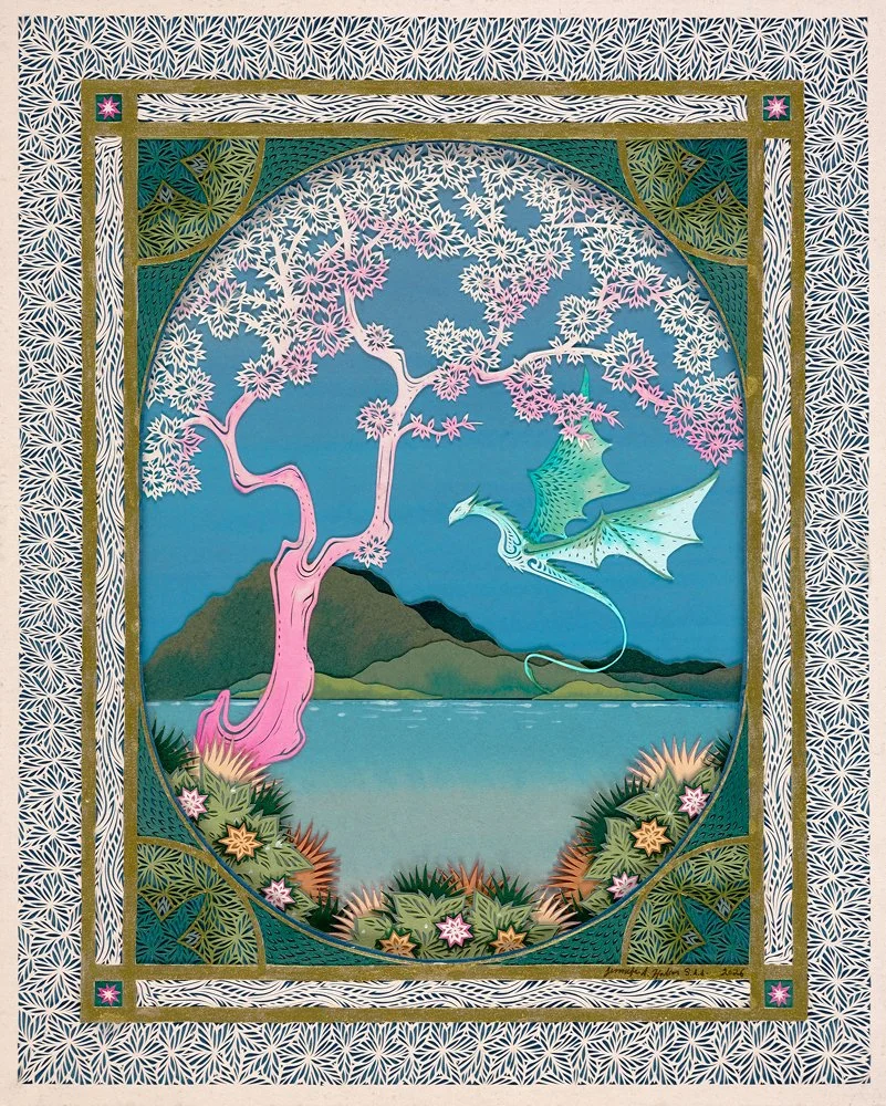 Now Available- Here Be Dragons!, 8inx10in, Hand Cut Paper. Available now at Peninsula Gallery. Contact peninsulagallery1@gmail.com for purchase inquiries.