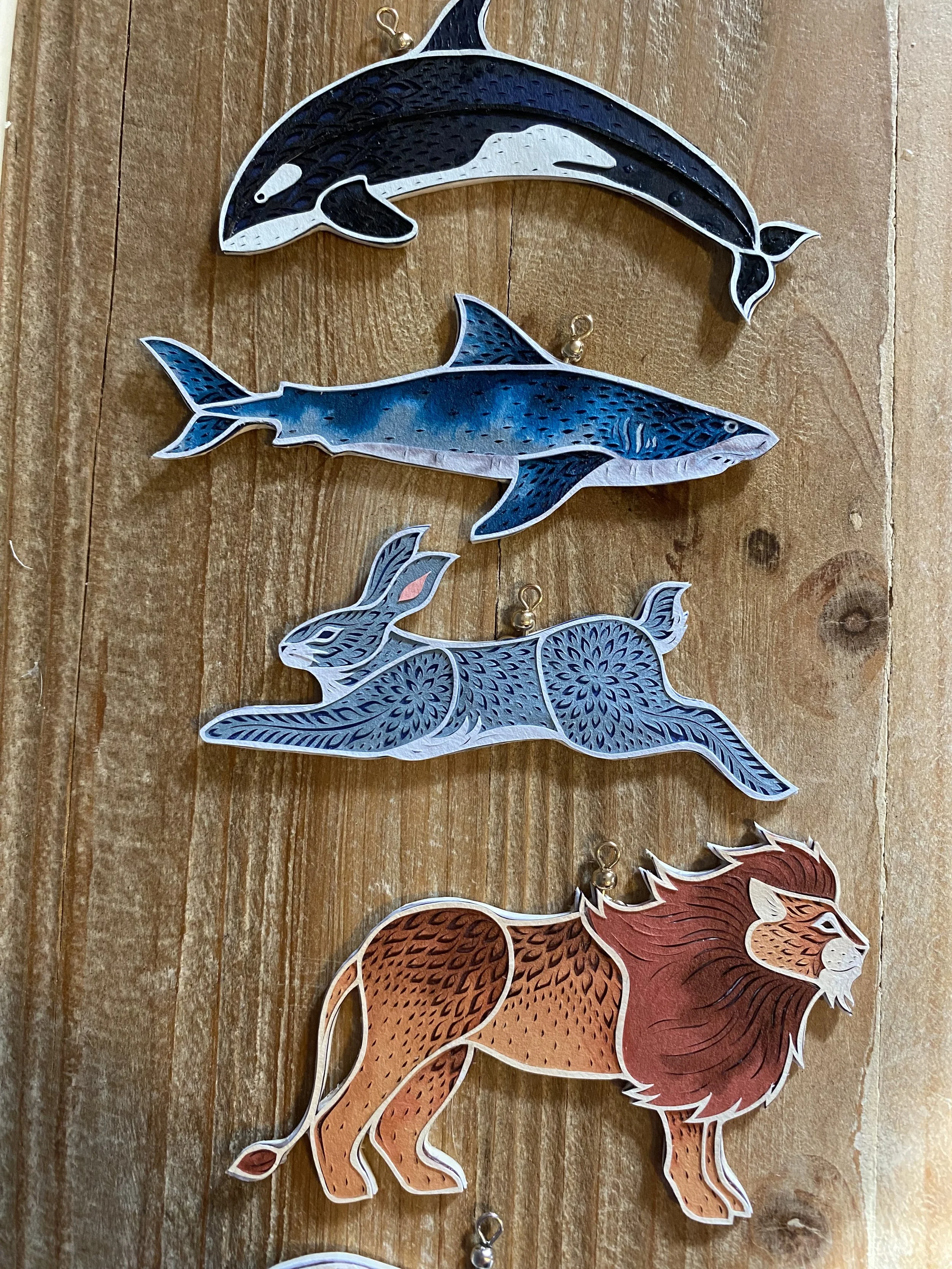 Hand cut paper tiger and great white shark ornaments. 2025 Holiday Collection